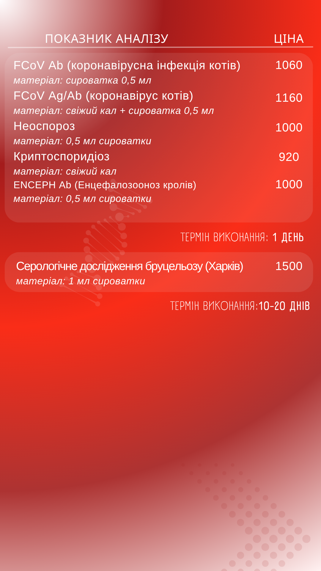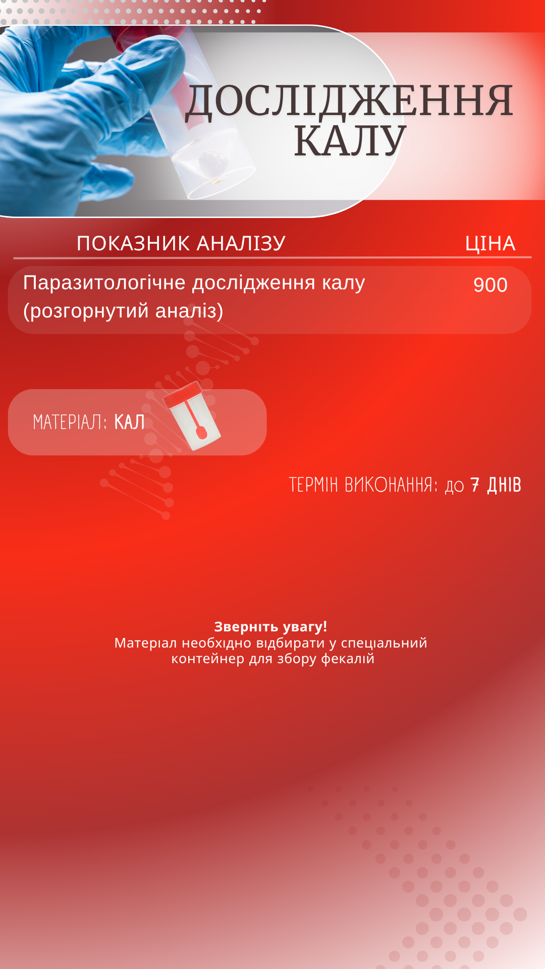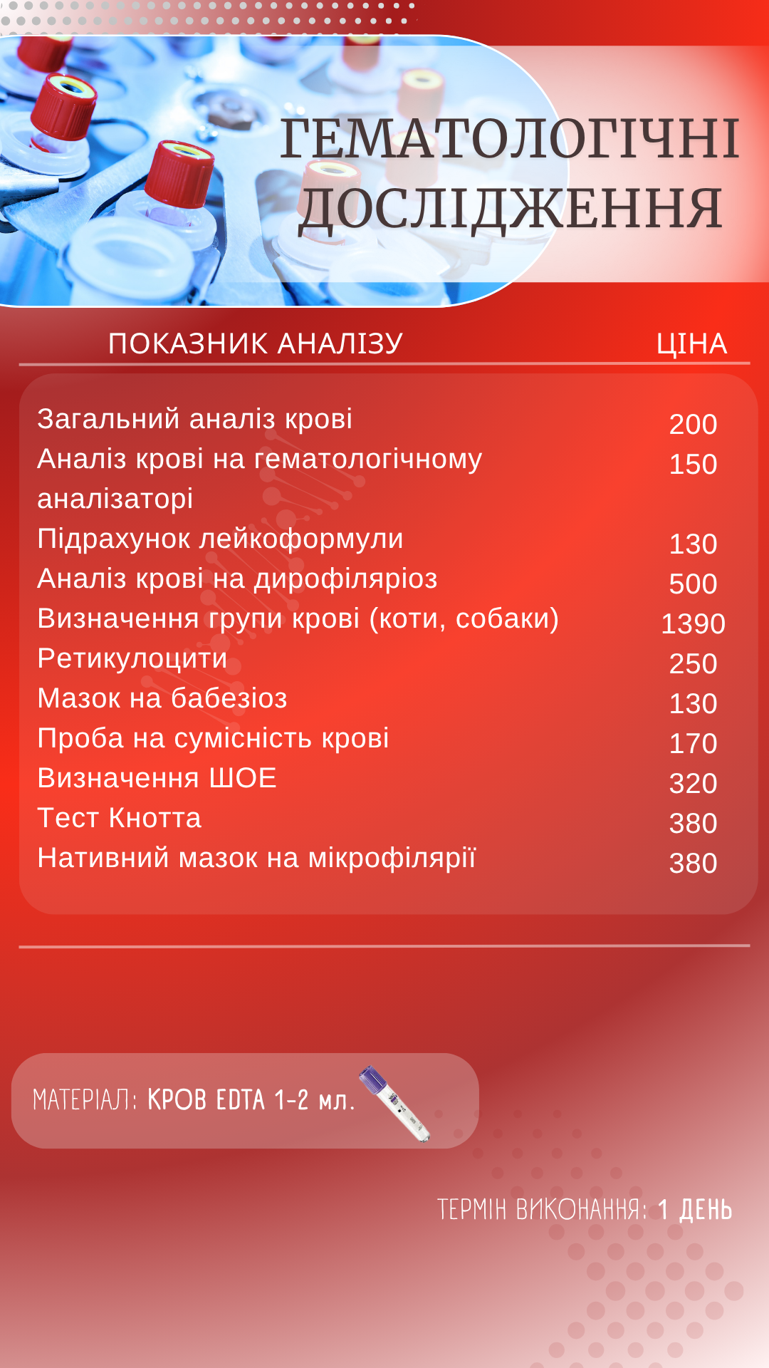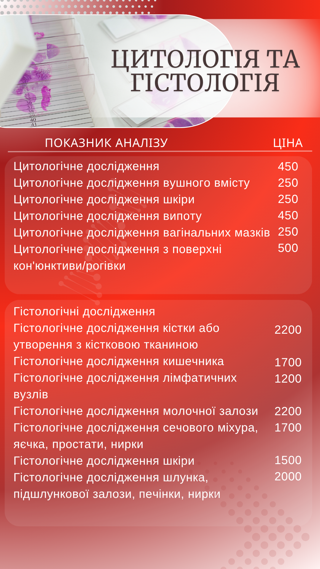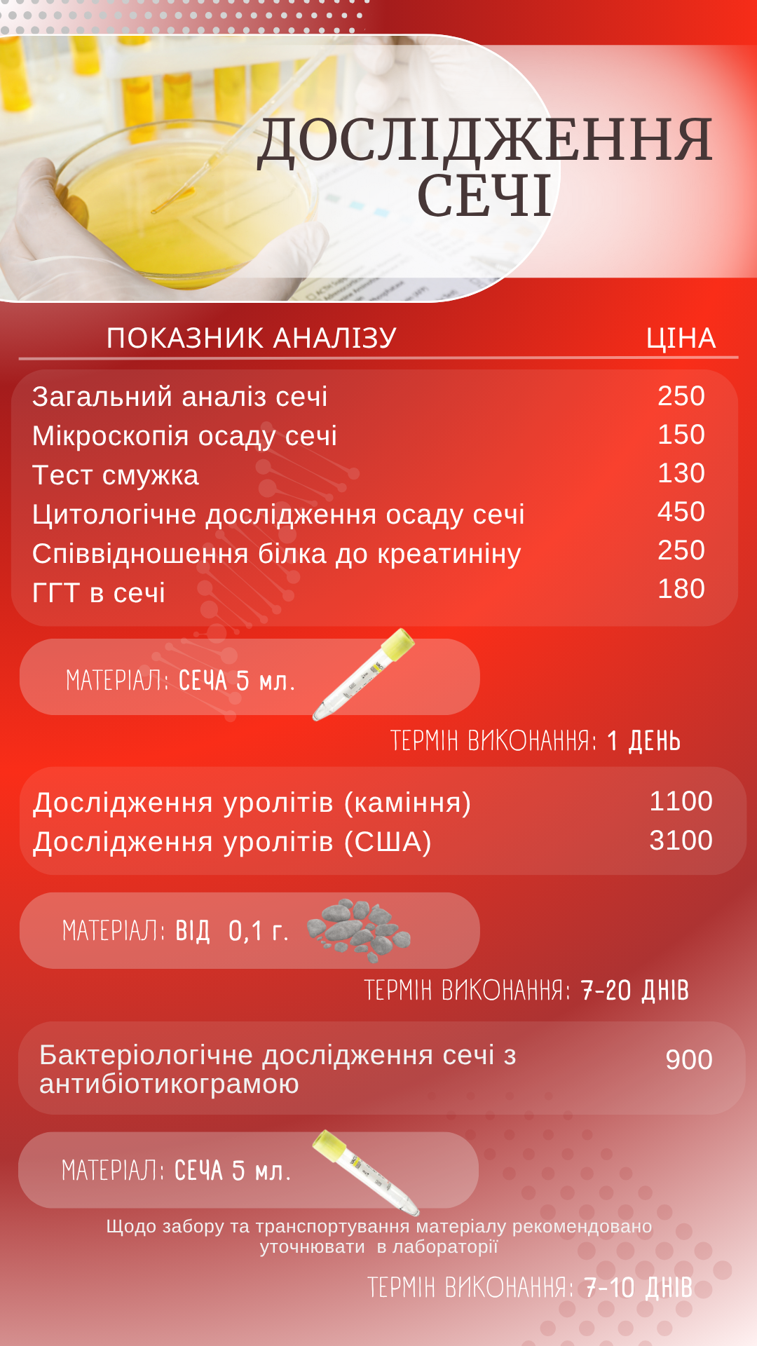 Тут Ви маєте змогу ознайомитись з переліком актуальних досліджень та їх вартості у нашій лабораторії!