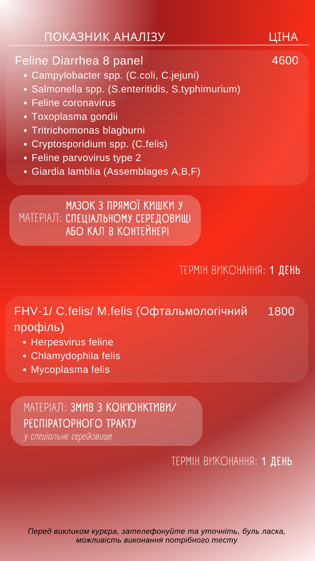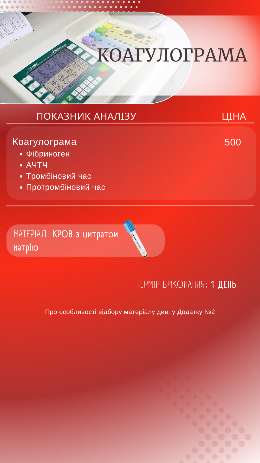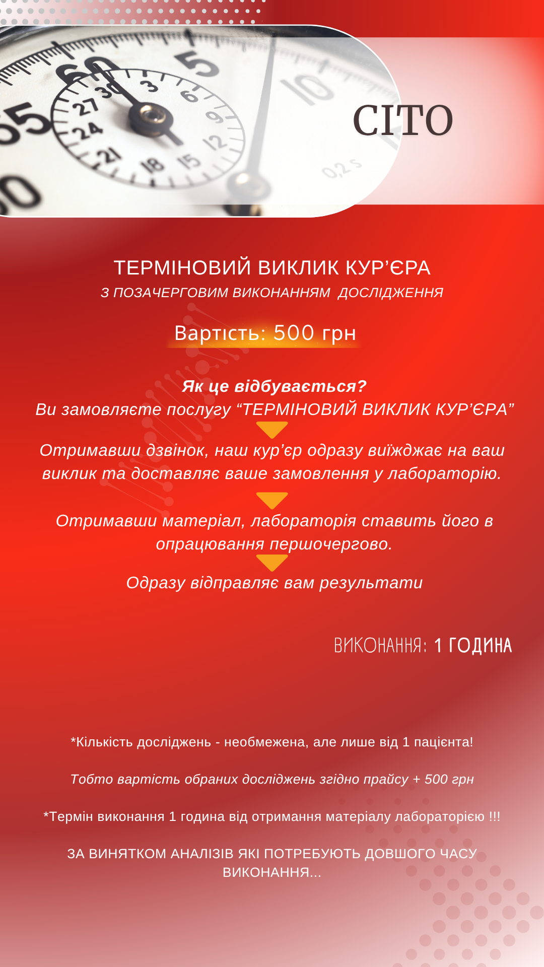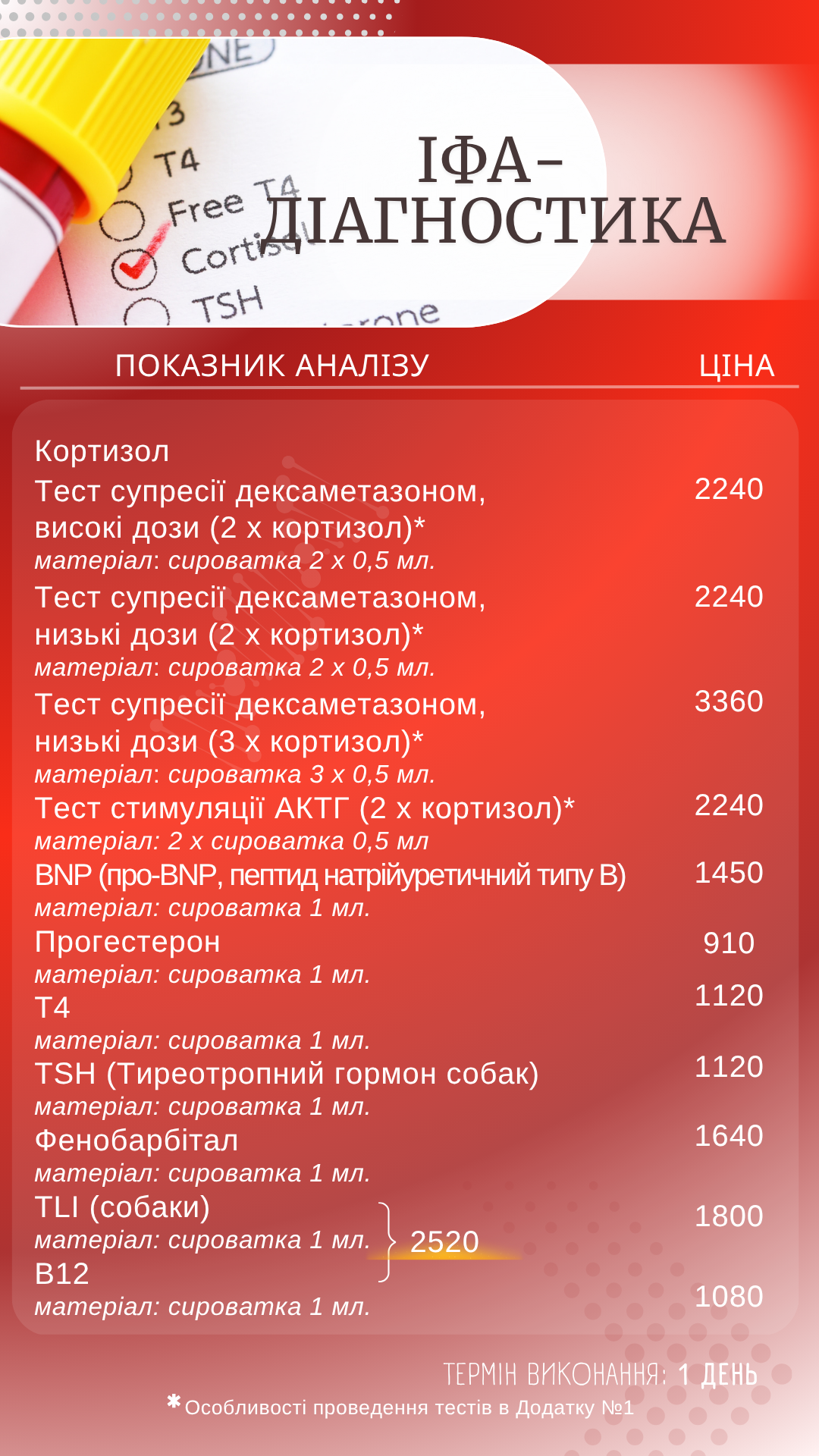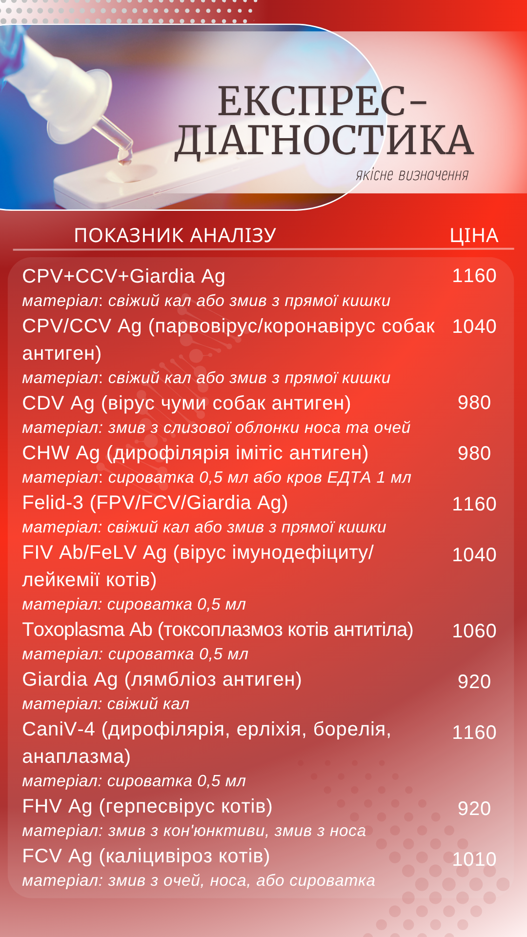 Тут Ви маєте змогу ознайомитись з переліком актуальних досліджень та їх вартості у нашій лабораторії!
