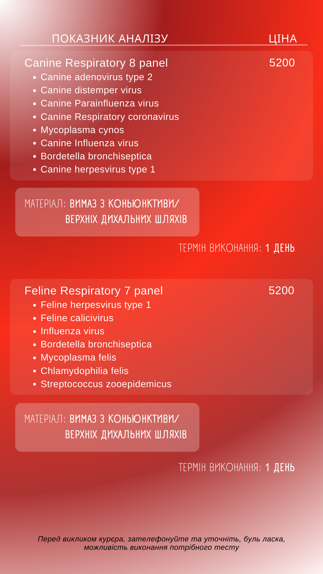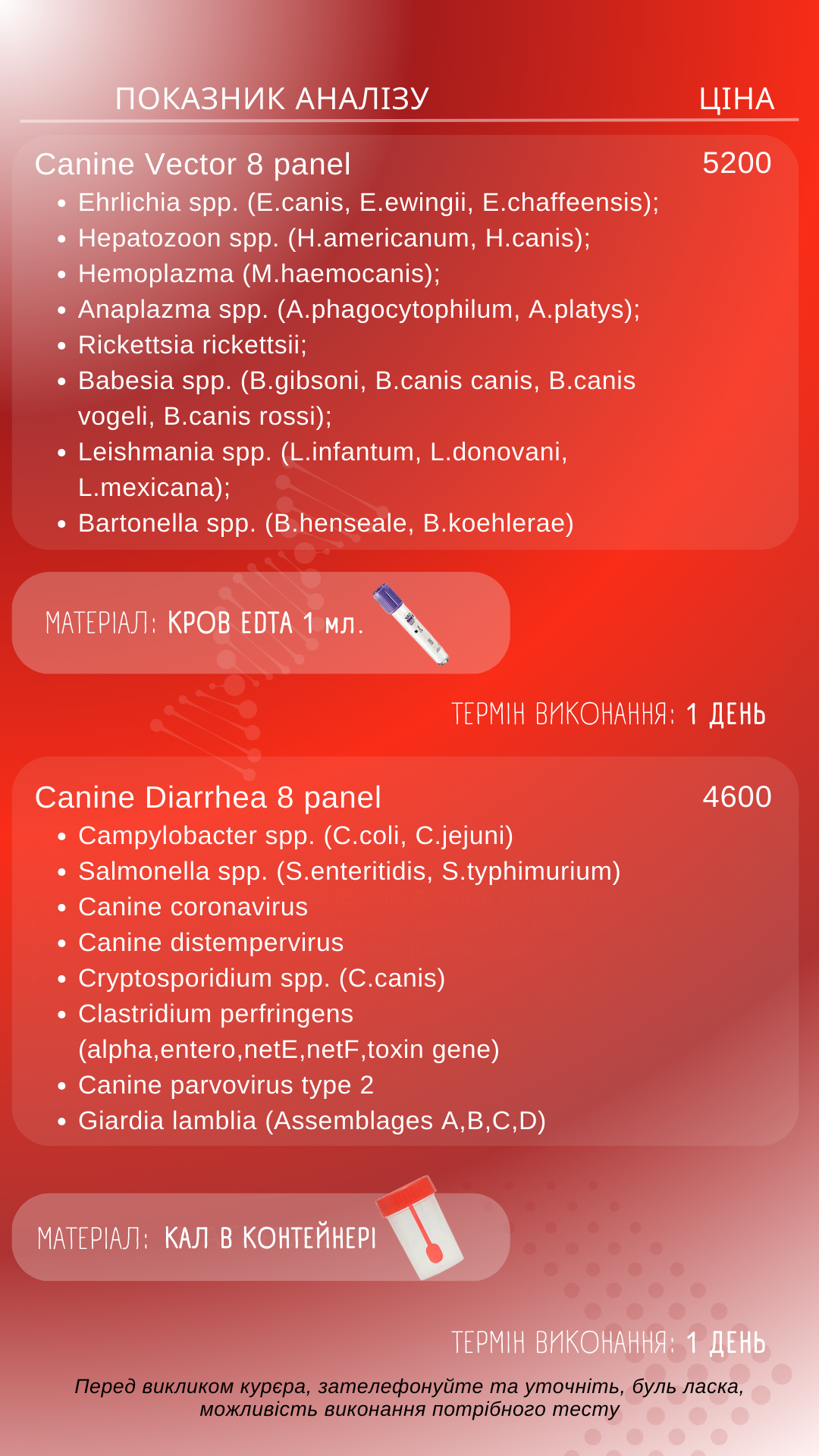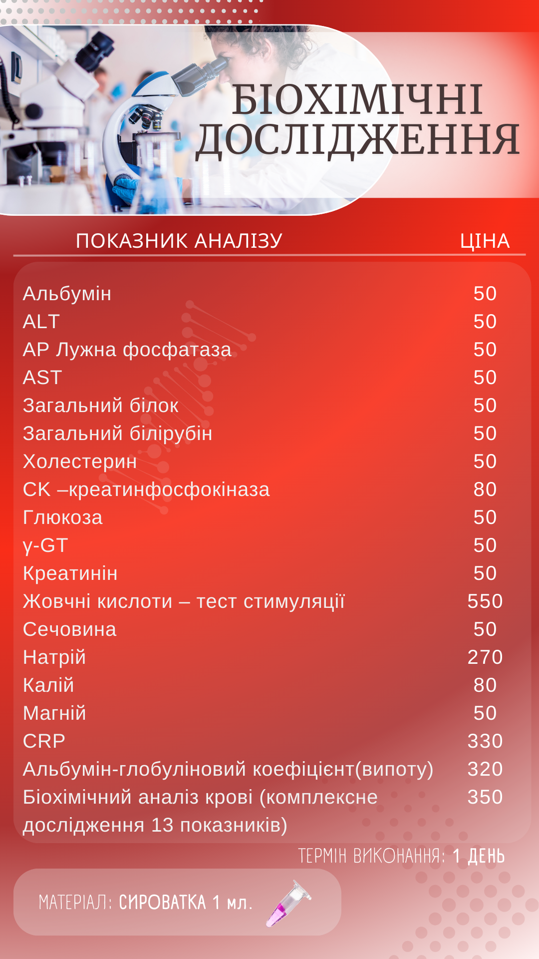 Тут Ви маєте змогу ознайомитись з переліком актуальних досліджень та їх вартості у нашій лабораторії!